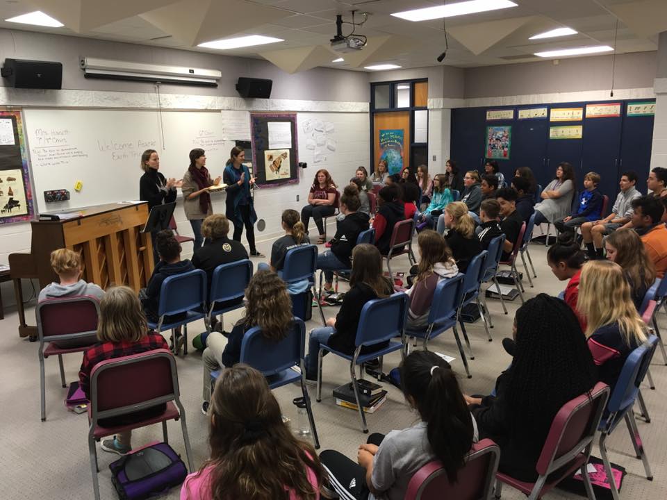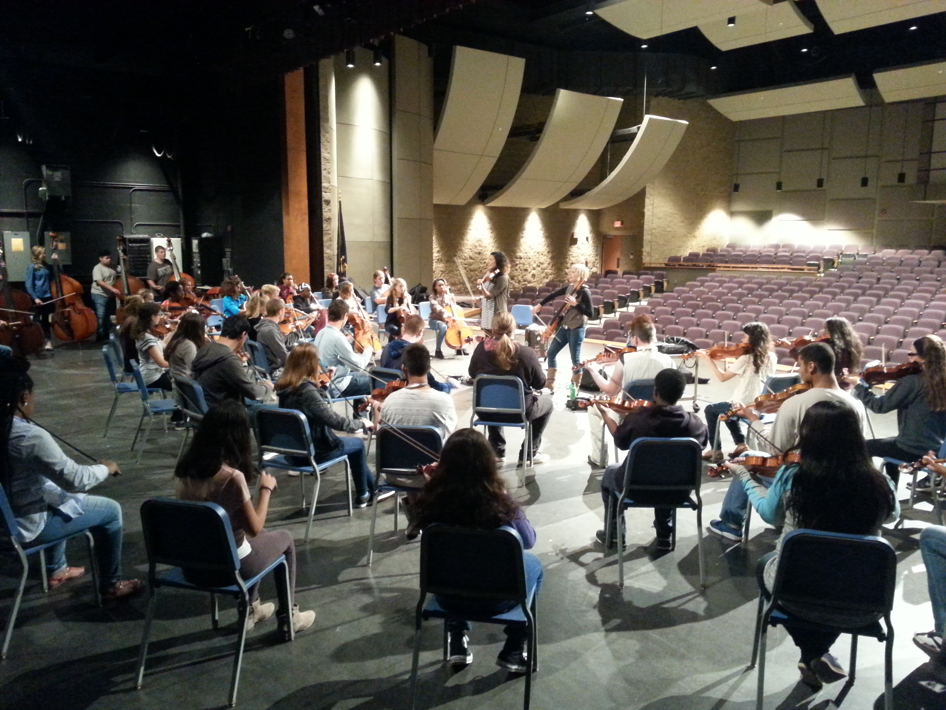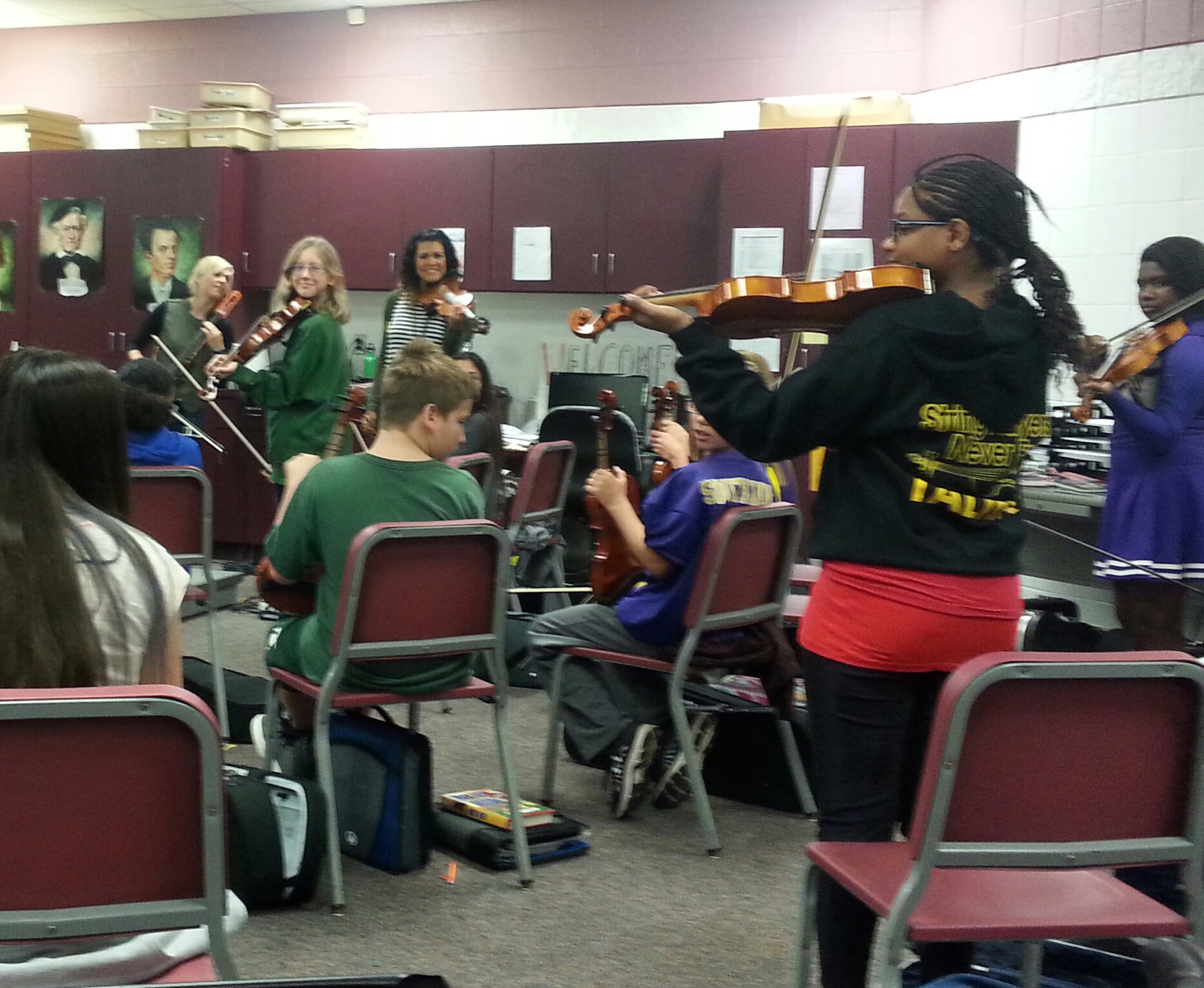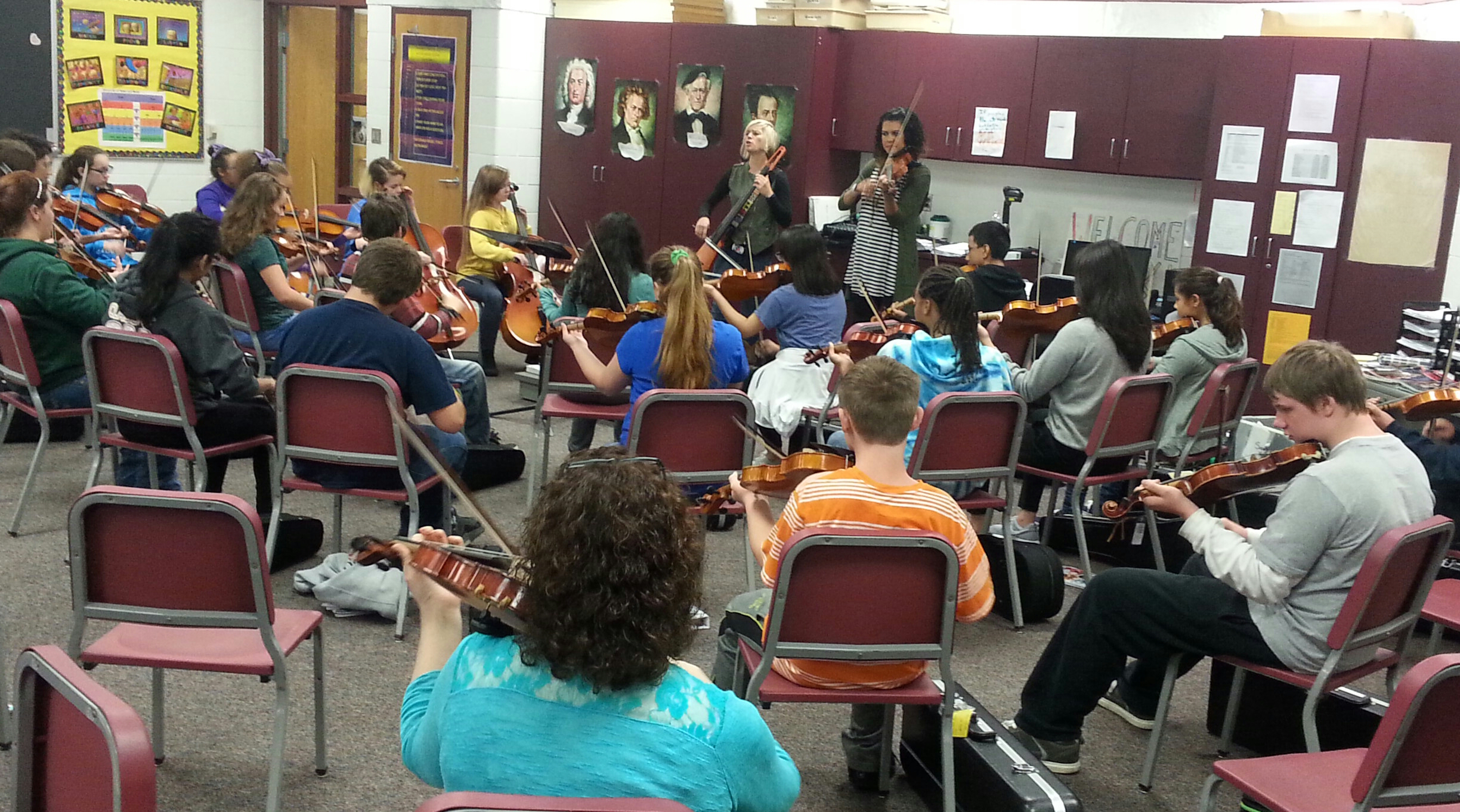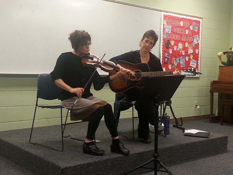 This October, Foundry Hall produced an educational program in the South Haven Schools featuring Michigan musicians, Diana Ladio and Alison Lynn of The Moxie Strings. In addition to two days of clinics with orchestra students from 6th to 12th grade, the project also provided a community concert free to all students and open to the community. The 75 minute concert closed with the orchestra students performing along side The Moxie Strings joined by drummer, Fritz McGirr. They played songs they had learned in the clinics and everyone had a chance to give an improvised solo.