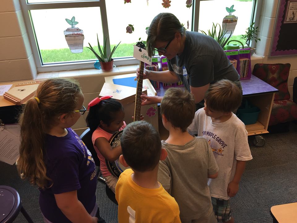 Tunebugs volunteers brought a dozen instruments to the Covert Public Library to share with the summer camp kids at Covert schools. Kids got to learn a little about guitar, mandolin, ukulele, violin, bass guitar, xylophone, drums and other percussion instruments. Then they got to play them all! It was a lot of fun and we think we inspired some kids to have fun with music!