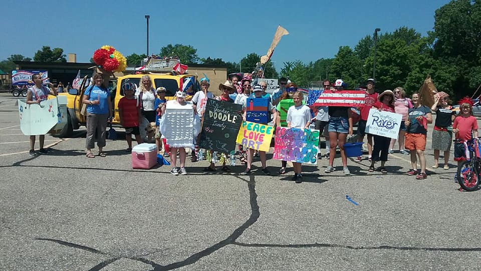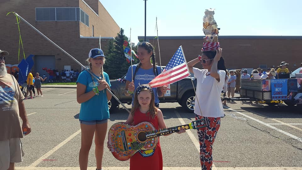 Foundry Hall teamed up with the Baseline Middle School Art Class (led by Sarah Rydecki) to create some fun visual art for the 4th of July parade. The theme was “Think outside the box” and there were several “make” sessions held to work on the theme. It was a VERY hot day, but we had a lot of kids join us in wishing everyone a Happy 4th of July and encouraging people to “pursue happiness through music and art”.